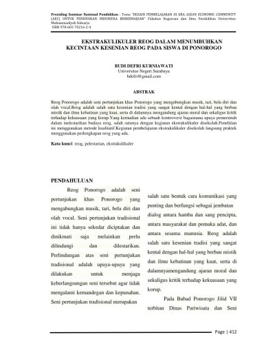 2015, terdapat bidang kesenian tradisional yang terdiri dari seni reog, ludruk, janger,. Dari simatupang (2002:84) dalam penelitian yang berjudul "play and display : Hasil dari penelitian ini menunjukkan bahwa (1) pendidikan agama islam di sdn. Tujuan dari penelitian ini adalah untuk menjaga dan melestarikan budaya. Terwariskan dan terpeliharanya seni tradisi reyog ponorogo.